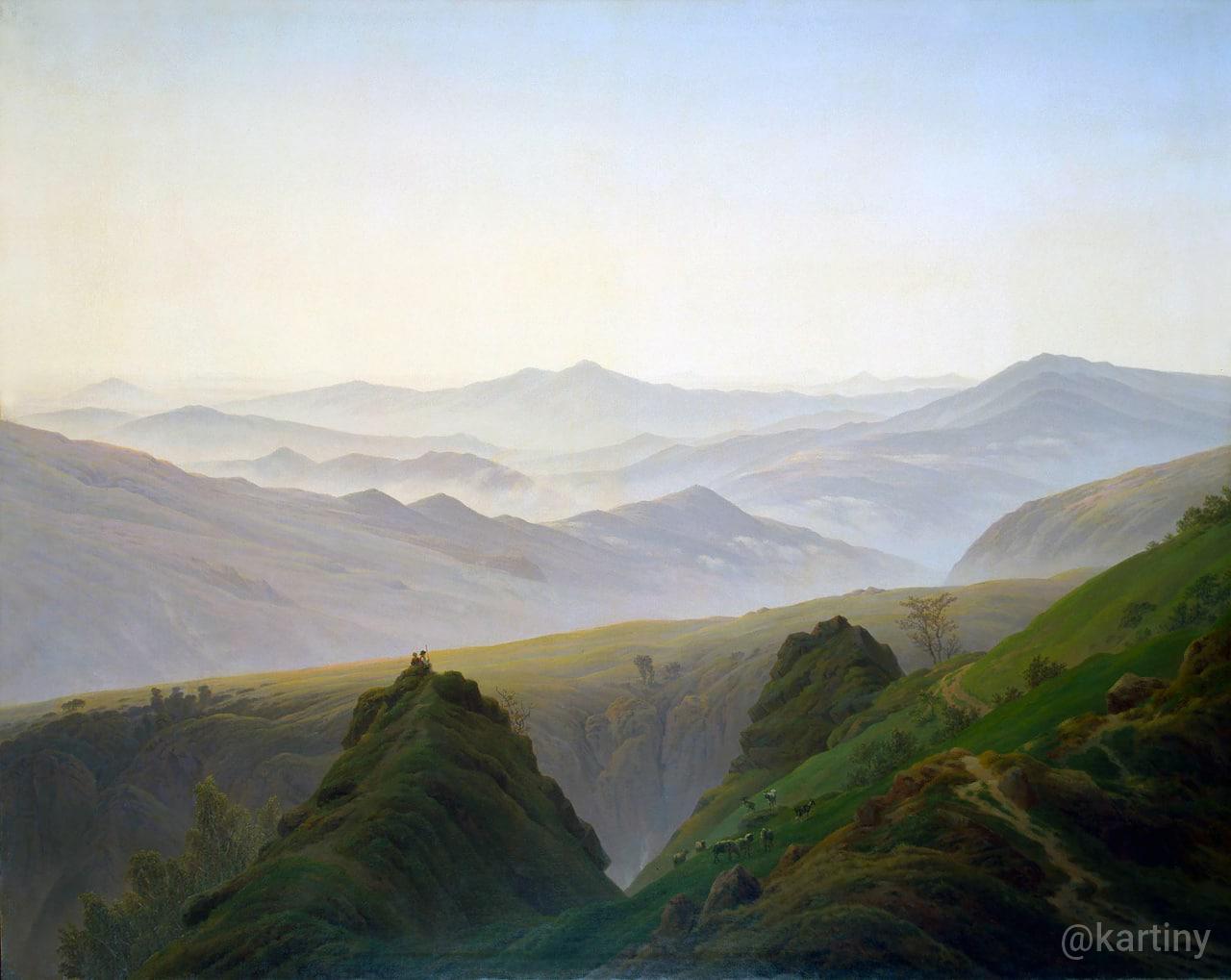 - «Странник над морем тумана» (Der Wanderer über dem Nebelmeer) – одна из самых известных работ Фридриха, где одинокая фигура стоит на вершине скалы, глядя на море тумана.