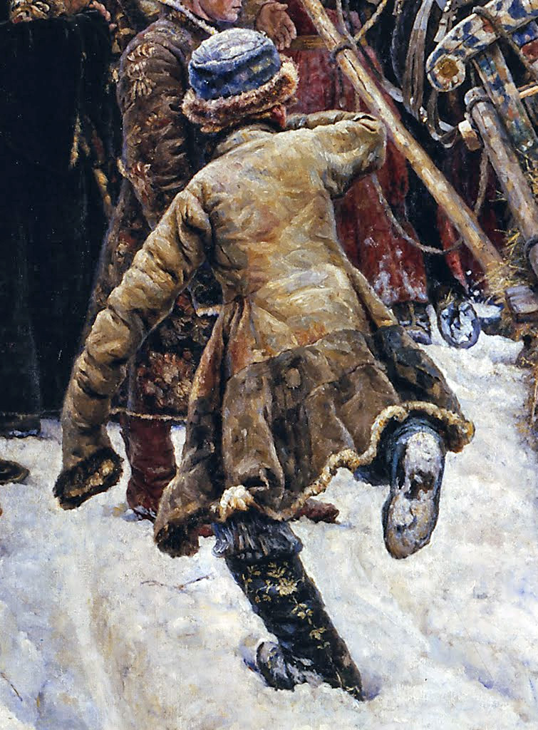 Эффект присутствия достигается также благодаря реалистичной передаче деталей. Суриков тщательно прописывает лица, одежду, предметы быта. Он не упускает ни одной мелочи, которая могла бы помочь зрителю погрузиться в атмосферу эпохи.